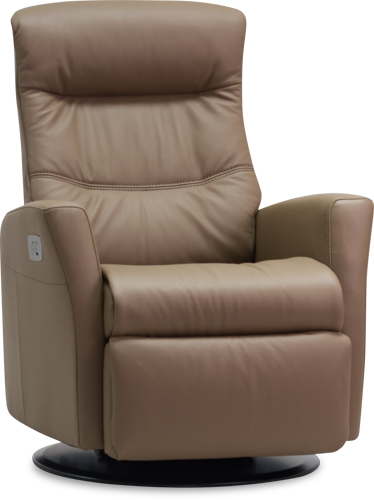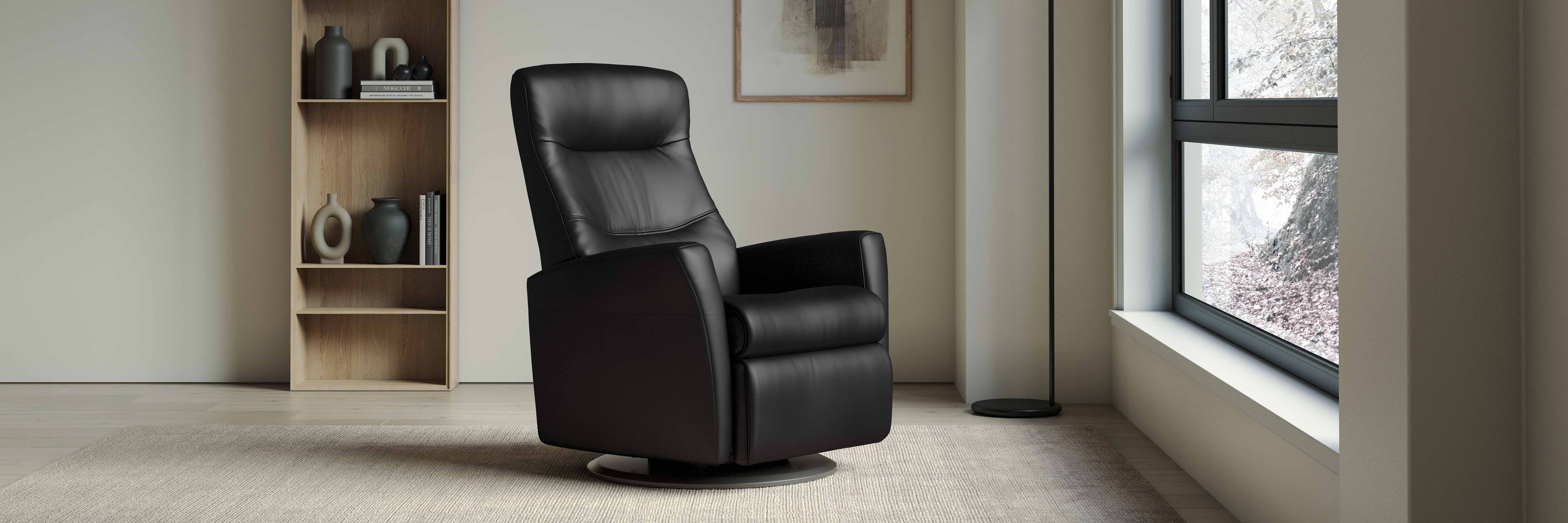 Våre relaxere har et stabilt sete og har trinnløs justering av rygg og leveres både i hud og tekstil.