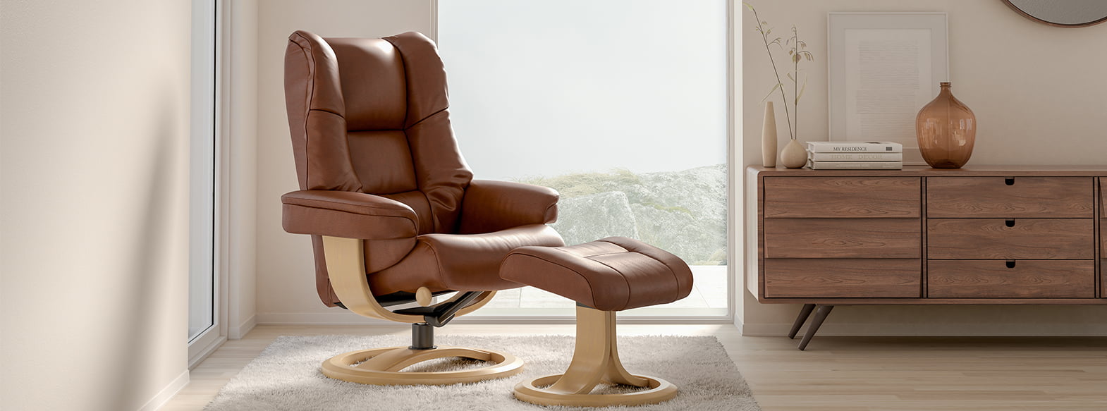 Sit back in your Nordic recliner and notice how comfort follows in every movement, thanks to our comfort-glide mechanism. Feel how the backrest envelops your back with our supportive, soft cushioning, which embraces the natural shape of your body. Put up your feet with the matching ottoman, ergonomically sloped to provide better leg support and improved blood circulation- because we believe comfort is part of a healthy lifestyle. With a durable interior construction built for strength and longevity, experience many years of comfort and satisfaction.
