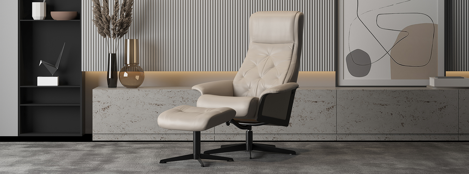 We make our Scandi recliners using the best quality materials- from higher-grade foam which holds and supports your natural body shape, to a solid construction for long-lasting form. Adding a touch of originality, we also include steel detailing on the sides of some of our Scandi recliners, to provide an eye-catching effect. With our 360° swivel function you’ll never miss a moment- from conversations to good movies. The Scandi recliner also features our comfort-precision headrest, which can be adjusted easily to support your head and neck while you relax, and a freestanding footstool with an ergonomically sloped design to provide better leg support and improved blood circulation.